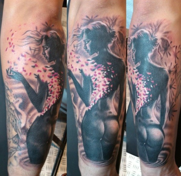 手臂诱人的裸体女人与蝴蝶纹身图片