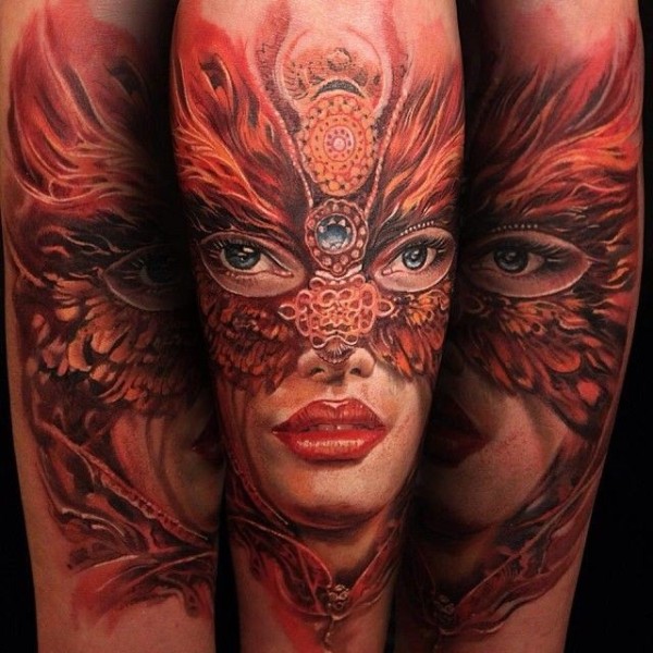 手臂新风格的彩色面具女人纹身图案