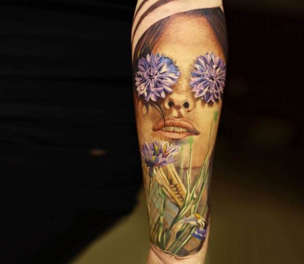 手臂现实主义风格的彩色妇女与鲜花纹身