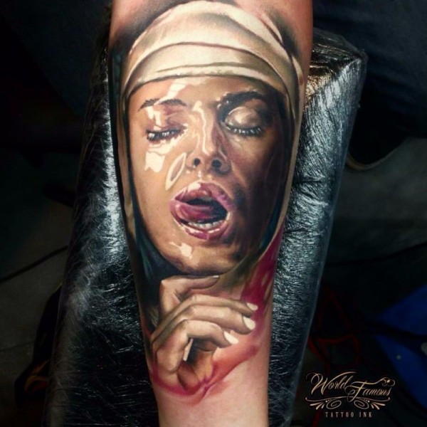 手臂现实风格的彩色诱人女性肖像纹身