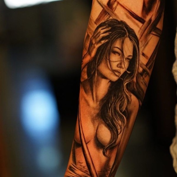 手臂逼真的彩色性感裸女纹身图案