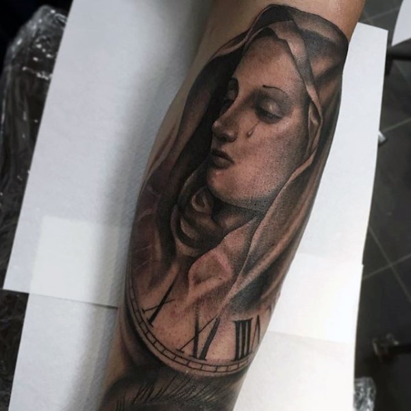 手臂雕刻风格的哭泣女人与时钟纹身图案