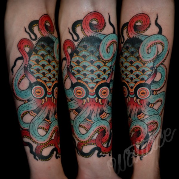 手臂新学校风格的彩色神秘章鱼纹身