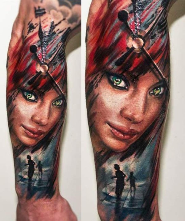 手臂插画风格的彩色女人与时钟纹身