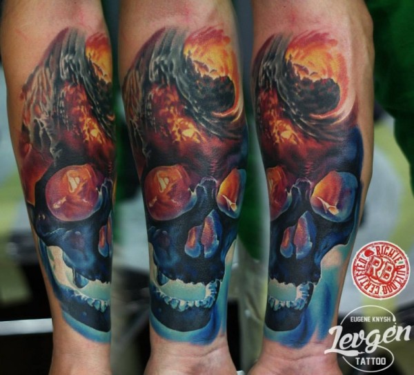 手臂现代风格的彩色燃烧的骷髅头纹身