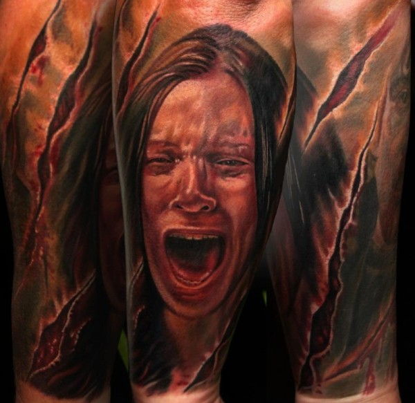 手臂令人毛骨悚然的尖叫女人纹身