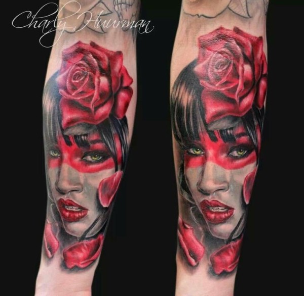 手臂彩色玫瑰与性感女人肖像纹身图片