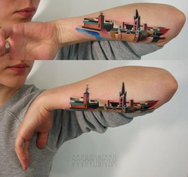 男性手臂彩色积木古城纹身图案
