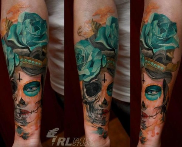 手臂墨西哥传统彩色花与骷髅纹身图案