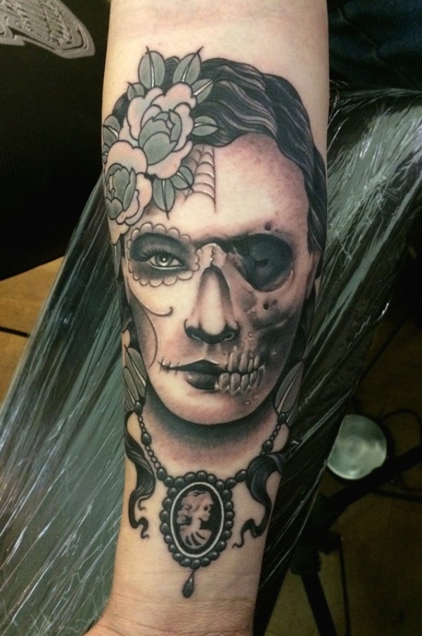 手臂墨西哥传统半女人半骷髅肖像纹身