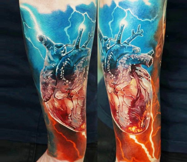 手臂现实主义风格的彩色人心脏和闪电纹身