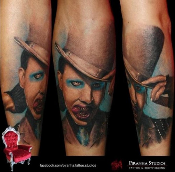 手臂逼真的彩色梅林曼森肖像纹身图案