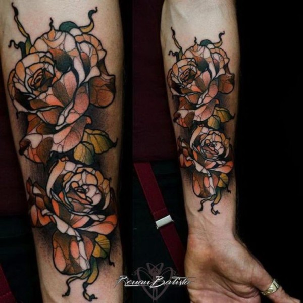 手臂水彩色玫瑰花纹身图案