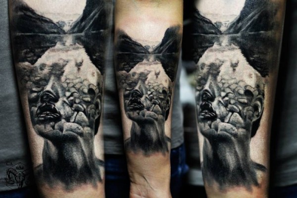 手臂黑灰色超现实主义风格的神秘画像纹身