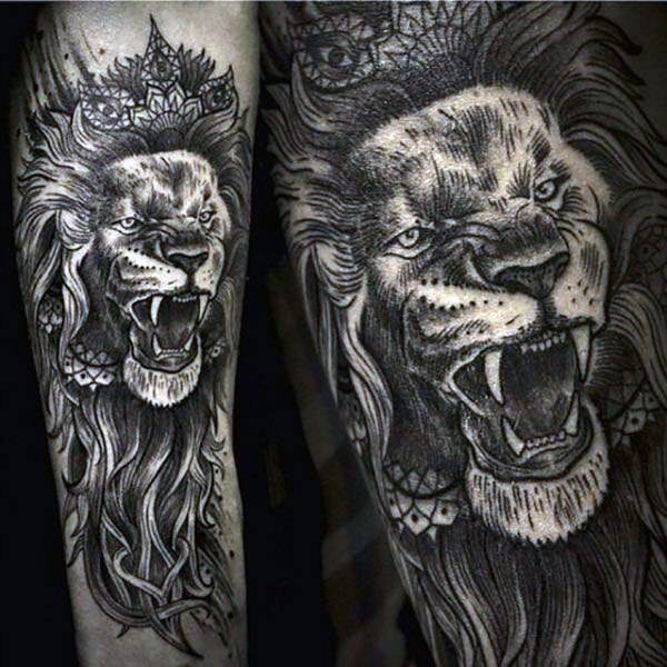 手臂黑灰雕刻风格详的吼叫狮子纹身图案