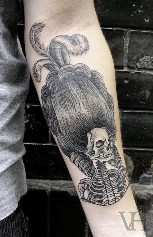 手臂黑灰雕刻风格的中世纪妇女骨架纹身
