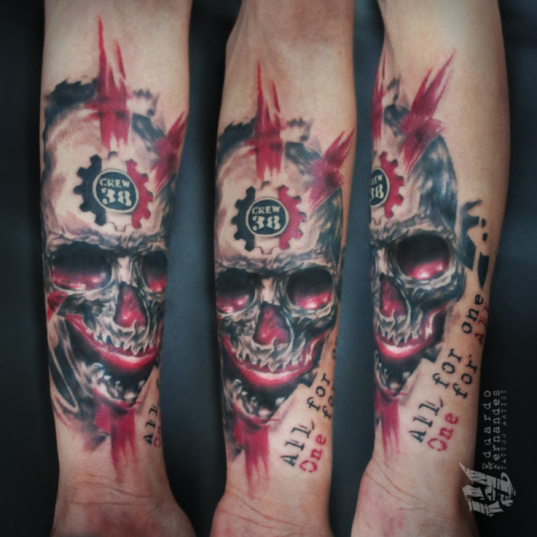 手臂插画风格的彩色人类头骨纹身图案