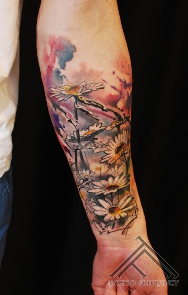 手臂彩色水墨色野花纹身图案