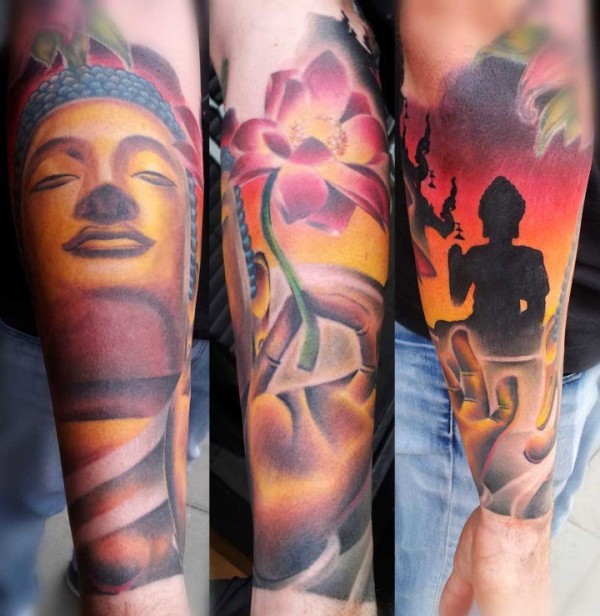 手臂插画风格的彩色如来佛祖雕像纹身