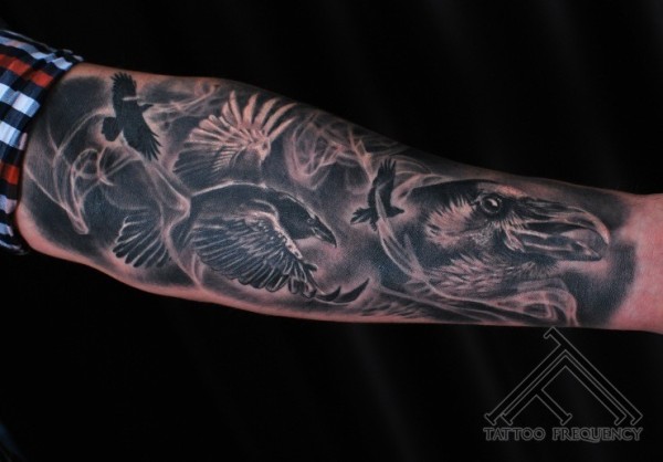 男性手臂灰洗式各种乌鸦纹身图案