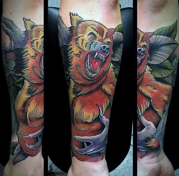 手臂新学校风格彩色愤怒的狼人纹身图案