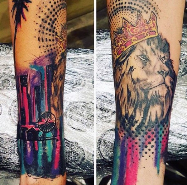 手臂PS图象处理软件风格的彩色夜城与狮子纹身
