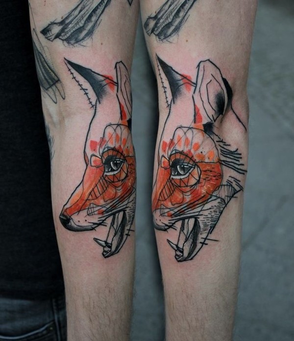 腿部彩色线条狐狸头纹身图案