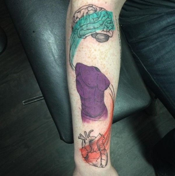 手臂雕刻式彩色人体大脑和心脏纹身图案