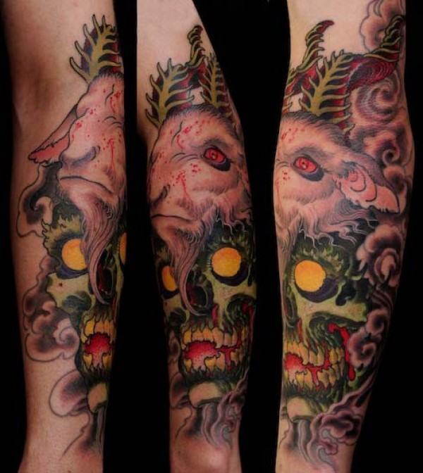 手臂新的学校风格彩色恶魔头骨纹身图案