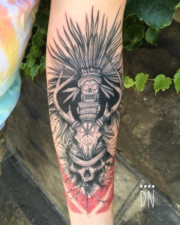 手臂华丽的彩色邪教头骨图腾纹身图片