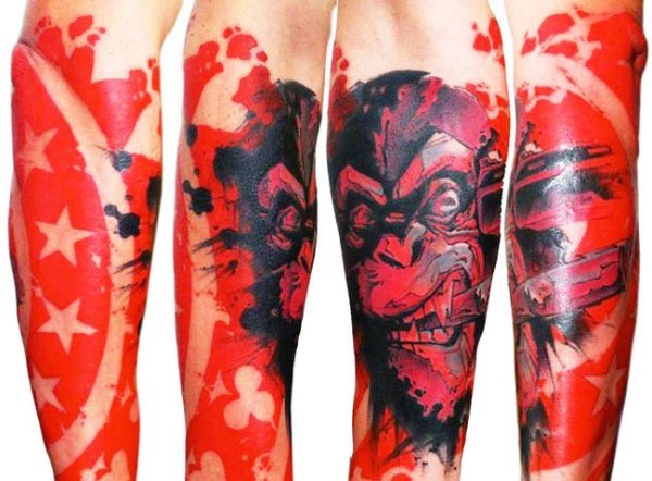 手臂彩色烟熏猴和红色盾牌纹身图案