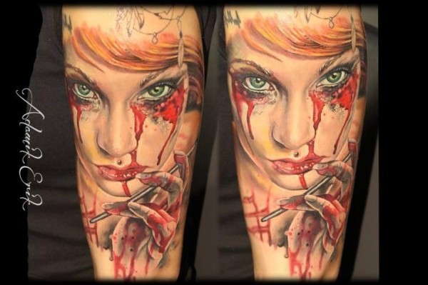 手臂毛骨悚然的恐怖血腥女人肖像纹身