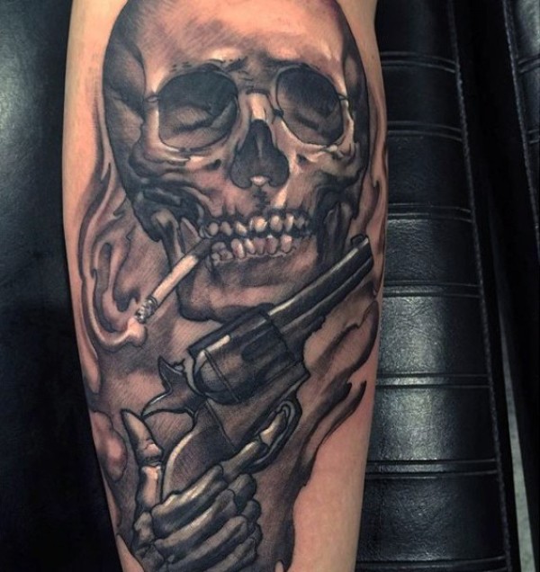 手臂吸烟的人类头骨与手枪纹身图案
