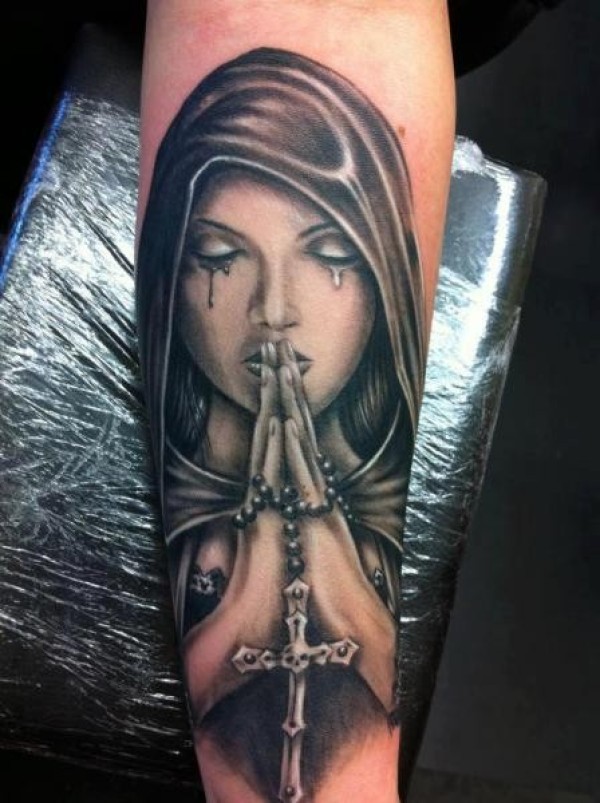 手臂新学校风格的彩色神秘祈祷女人纹身