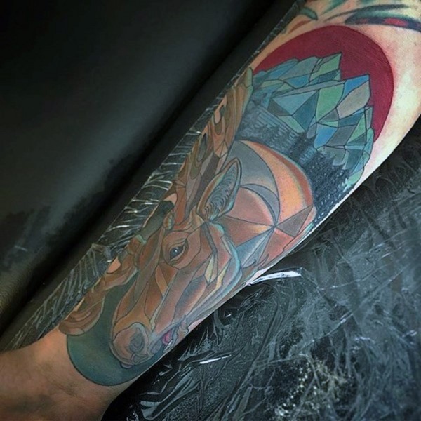 手臂彩色麋鹿头部与山林纹身图案