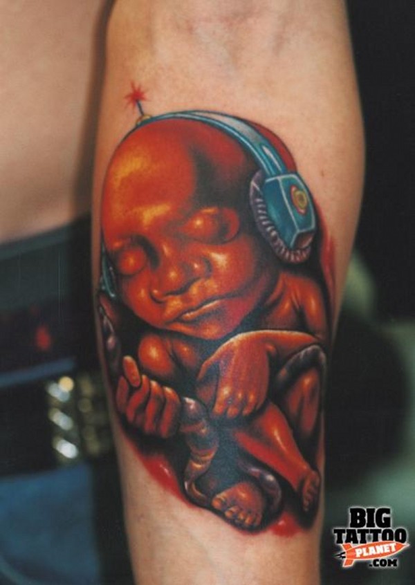 手臂彩色奇怪的人类胚胎耳机纹身图案