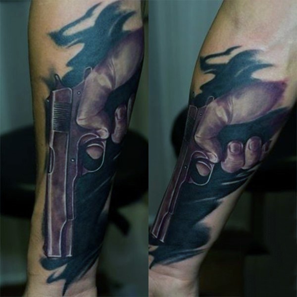 手臂惊人的彩色现实主义风格手持手枪纹身