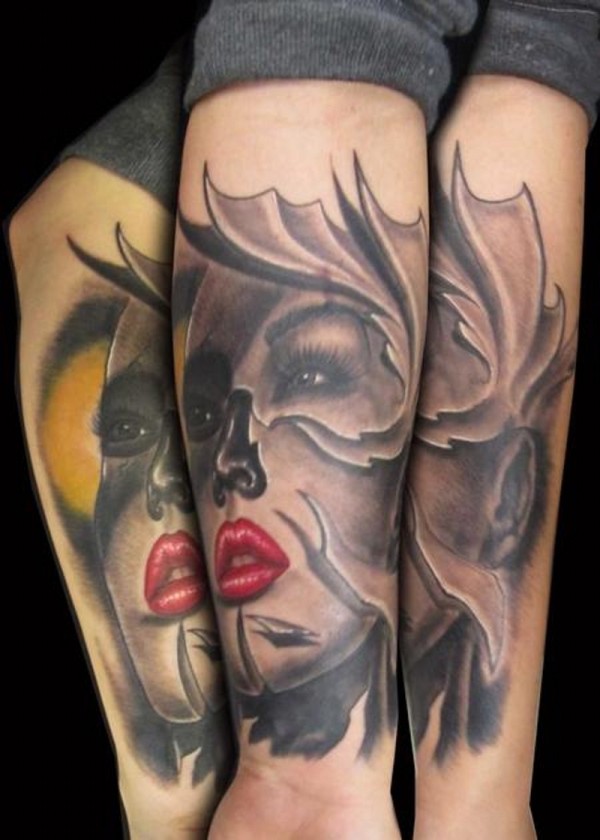 手臂怪异的彩色神秘女人肖像纹身图片