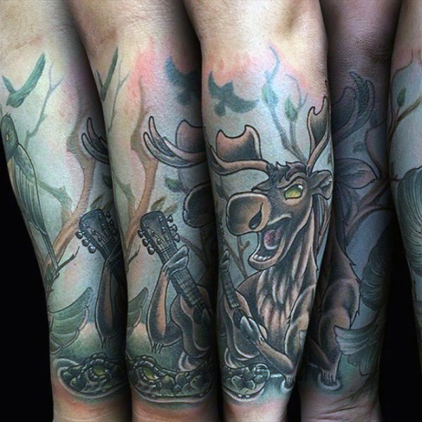 手臂彩色老派风格的麋鹿弹吉他纹身