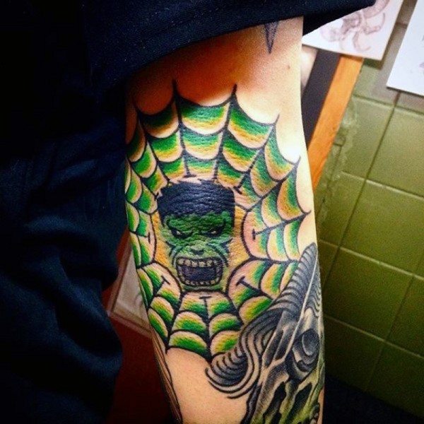 手臂彩色蜘蛛网的绿巨人纹身图案