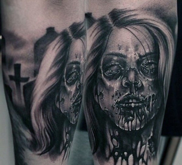 手臂恐怖电影主题的血腥僵尸女人纹身图案
