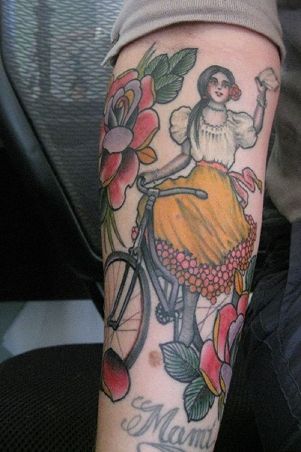 手臂彩色骑自行车的女人纹身图案