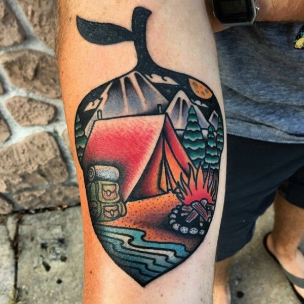 手臂彩色叶子形状的夜间露营风景纹身