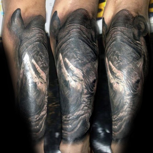 手臂黑灰逼真的大犀牛头部纹身图案