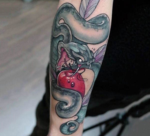 手臂现代风格彩色蛇与苹果纹身图案