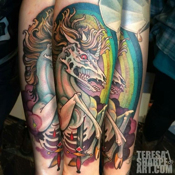令人印象深刻的旧学校彩色僵尸独角兽纹身