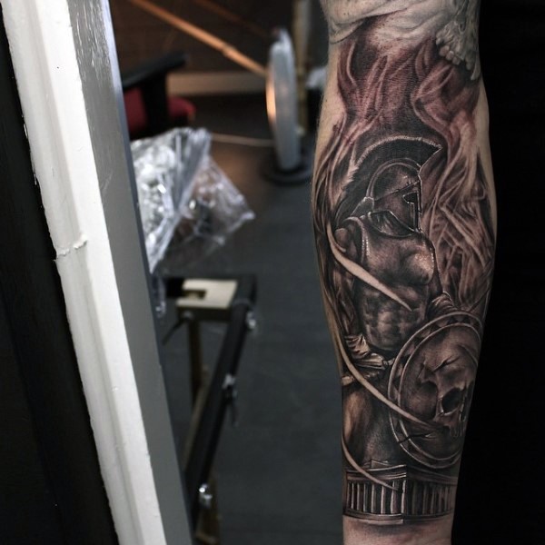 手臂棕色滑稽的战士和建筑纹身图案