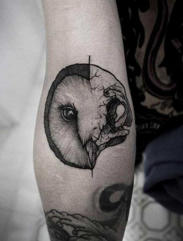 手臂灰色半猫头鹰半头骨纹身图案