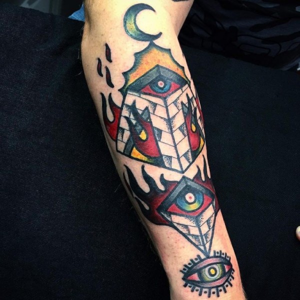手臂老派风格的彩色神秘金字塔与眼睛纹身
