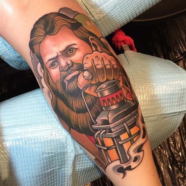手臂老派风格的彩色巫师与灯纹身图案